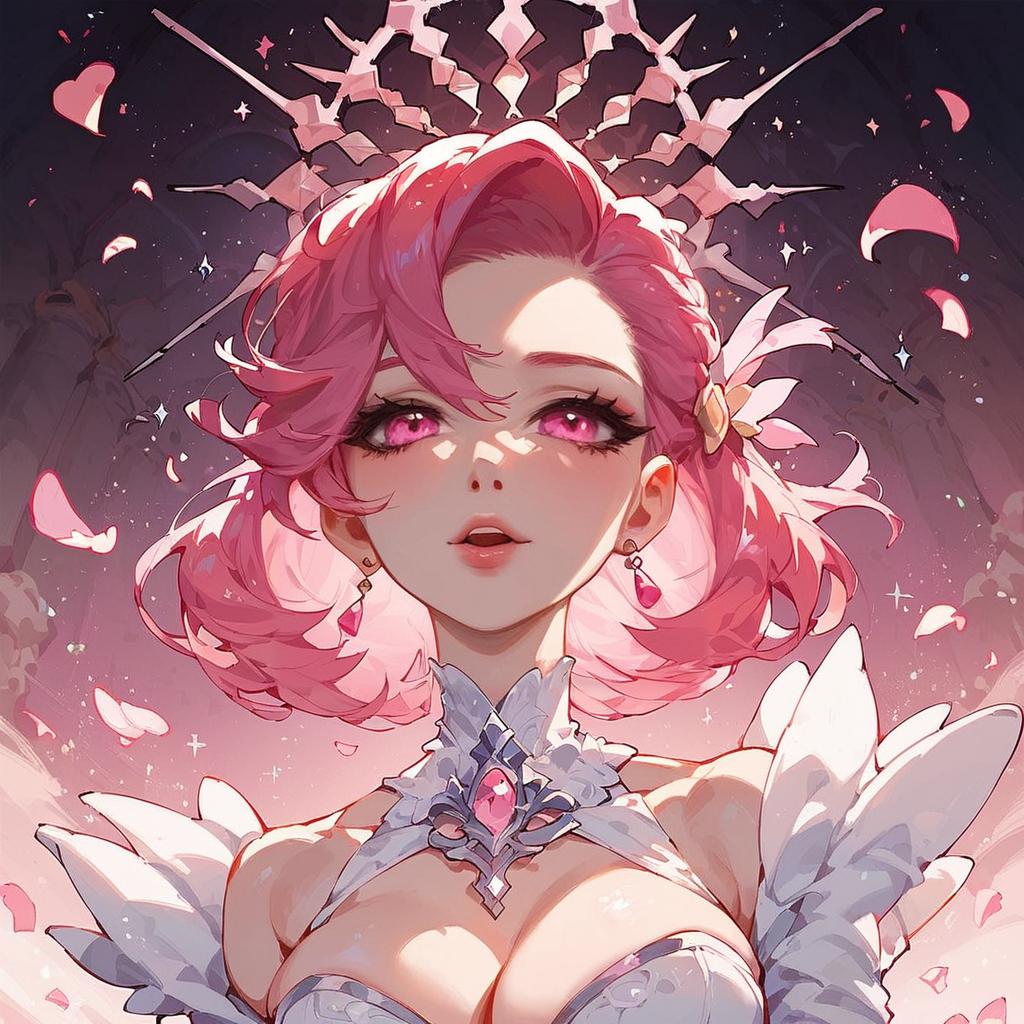 Score_9, score_8_up, score_7_up, cure yell, night, ruined building, sparkles, glitters, multicolored background, shiny, glowing, lens flare, petals, pink background, pink theme