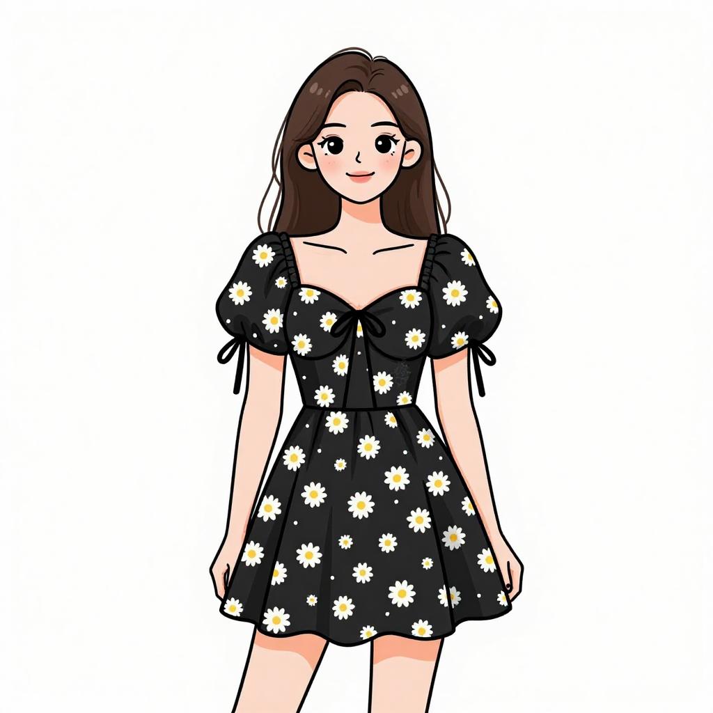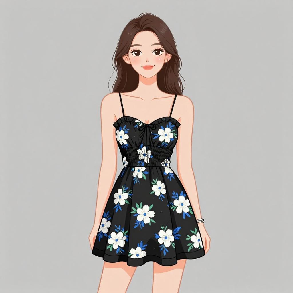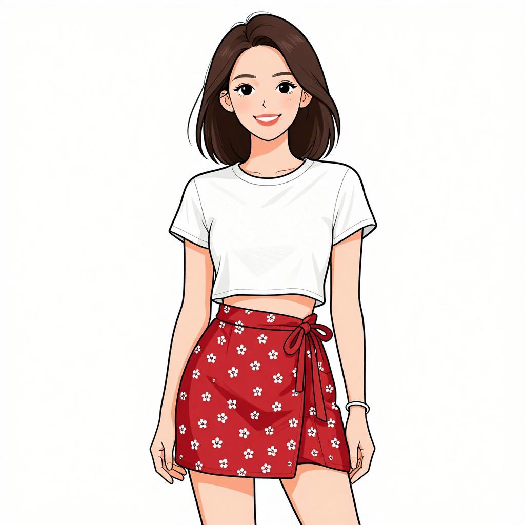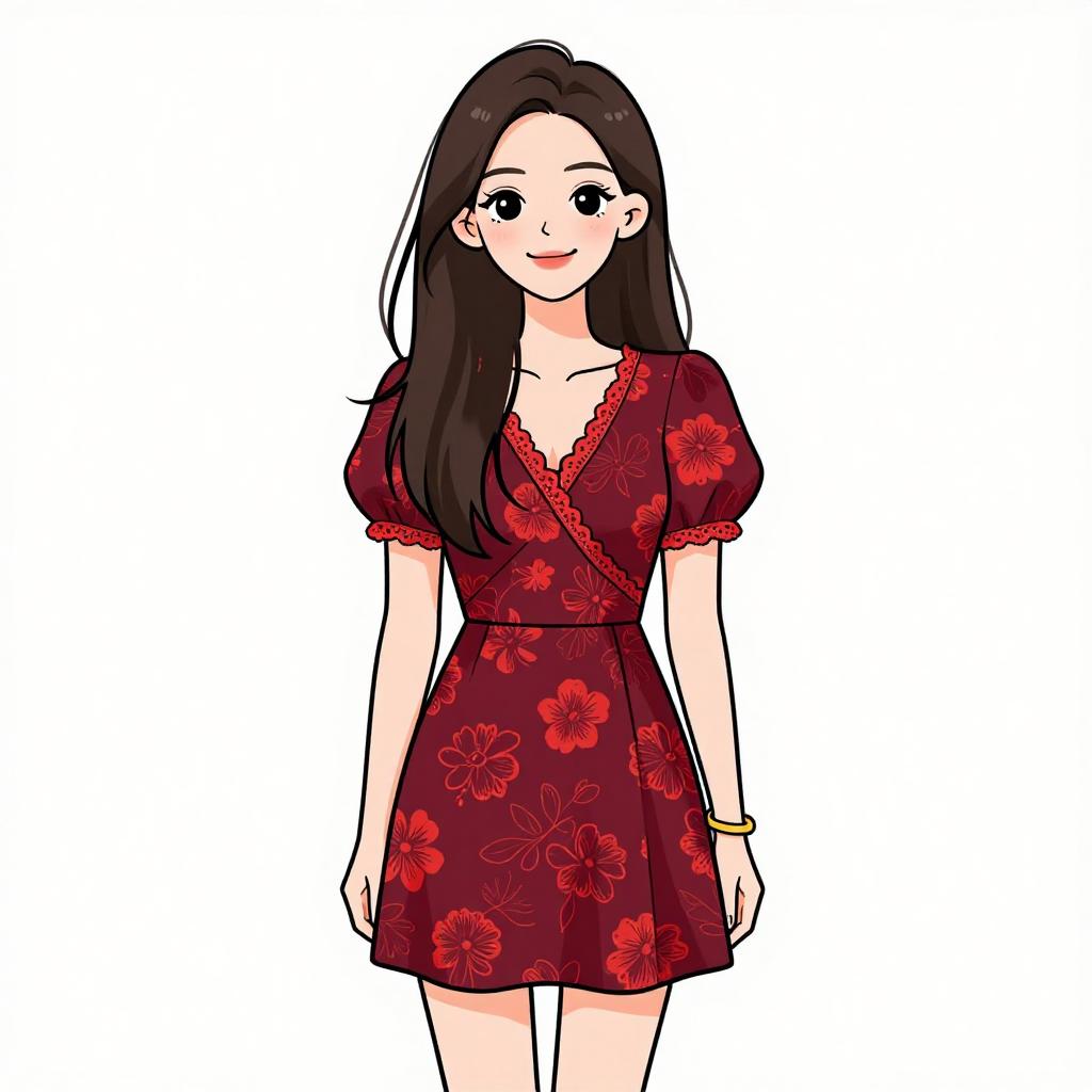 Woman with pretty face and pretty hair. smiling Woman, casual summer style, red mini dress with small white floral print, short cap sleeves, lace-up detail at the chest with silver eyelets and white laces, v-neckline, slightly flared skirt, choker necklace, plain white background. --sref 1467