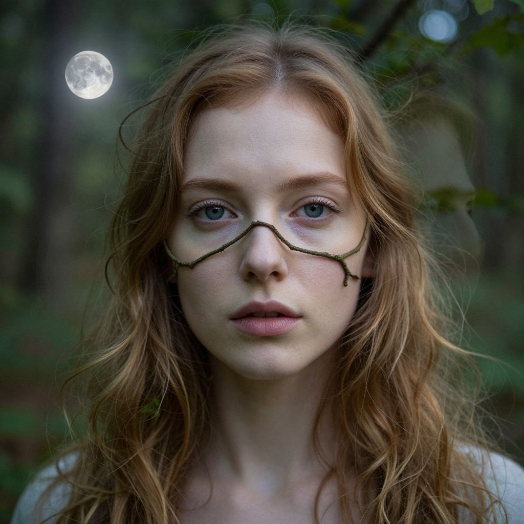 Photograph of a fair-skinned, red-haired woman with blue eyes, standing in a forest at night. She has wavy, shoulder-length hair and wears a thin, natural branch across her nose. Her expression is neutral, with slightly parted lips. The background is dark green, with blurred tree trunks and foliage, creating a mysterious atmosphere. A full moon is visible in the top left corner, adding a luminous glow to the scene. She is wearing a light-colored top, though details are not distinct. The overall mood is ethereal and enchanting.
