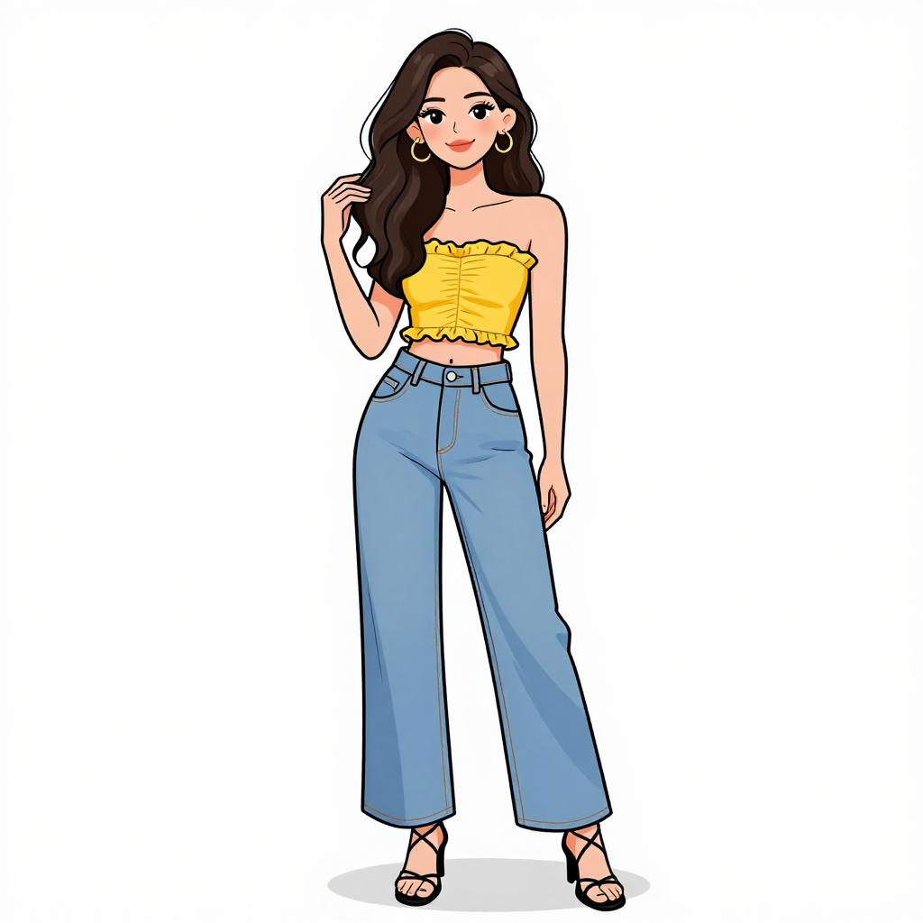 Woman with pretty face and pretty hair. smiling Woman, casual chic, golden yellow bodysuit with a scoop neckline and thin shoulder straps, high-waisted navy blue wide-leg pants with white pinstripes, brown leather belt with a simple buckle, black flat sandals with thick straps, white studio background. --sref 1467