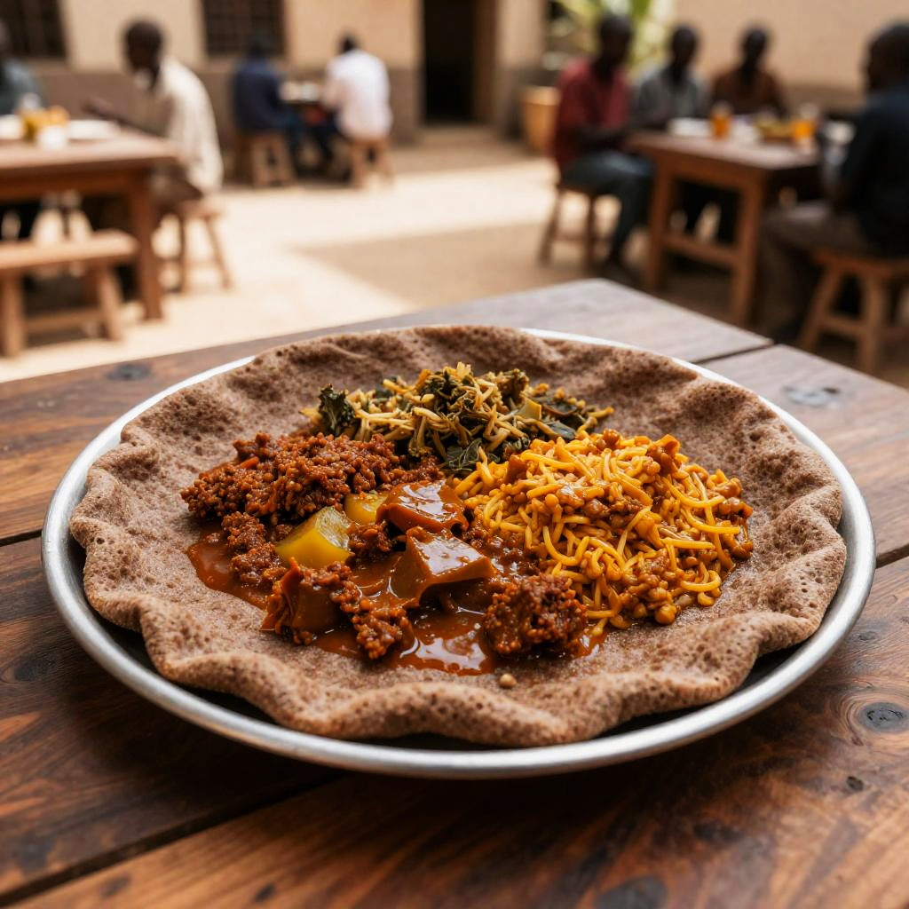 A Ethiopian injera platter featuring spongy fermented flatbread layered with vibrant, saucy stews. Captured in a sunlit communal courtyard with a rustic wooden table using a wide-angle lens for stunning detail and depth, presented in high resolution with immersive color grading.