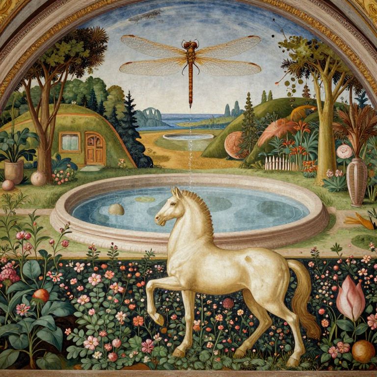 This digital illustration in a Renaissance style depicts a vibrant garden scene. A white, elegant horse with a golden mane and tail stands gracefully in the foreground, surrounded by lush, colorful flowers. Behind the horse is a circular, stone fountain with clear blue water, situated in the center of the garden. The background features a picturesque landscape with rolling hills, a small wooden house with a green roof, and a large dragonfly with intricate wings hovering in the sky. The scene is framed by an ornate arch with intricate patterns. The garden is filled with various plants, flowers, and potted plants, adding to the rich, detailed texture of the image.