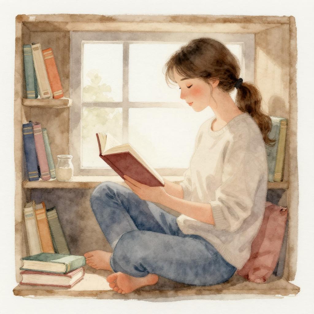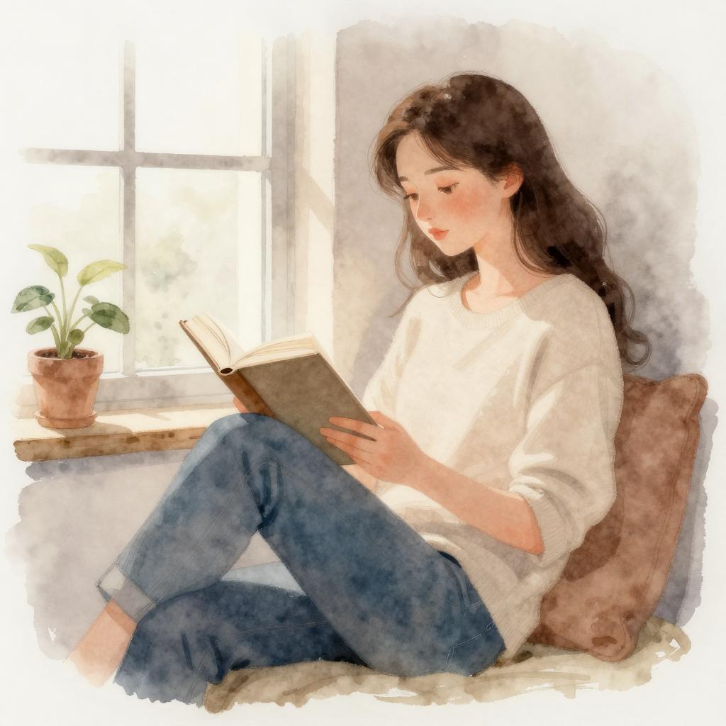 A watercolor illustration of a young woman with long dark hair, dressed in a light sweater and blue jeans, sitting comfortably in a cozy reading nook by a window. She is engrossed in reading a book, with soft, warm lighting and gentle brushstrokes enhancing the peaceful and inviting atmosphere. A small potted plant sits on the windowsill, adding a touch of nature to the scene.