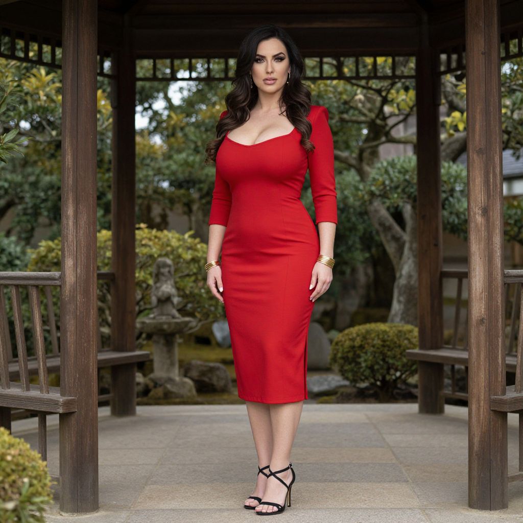 A Svelte woman in a chic, form-fitting red midi dress with three-quarter sleeves and a side slit, paired with strappy black heeled sandals, stands under a gazebo in a Japanese garden, reminiscent of Audrey Flack's vibrant style, accessorized with gold bangle bracelets. Sexy. Pretty face and beаutiful eyes. Big breasts