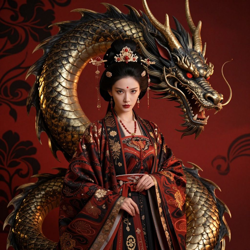 A striking and intense portrait of a regal woman entwined by an elaborate dragon, She stands with an air of authority, dressed in traditional East Asian attire with rich, intricate patterns in shades of deep red and black, adorned with golden floral accents, Her black hair is elegantly styled in an elaborate updo, decorated with delicate red and gold hairpins that add a touch of royalty and mystique, The dragon coils protectively around her, its scales a complex texture of black and ivory with gold highlights, and fierce, red eyes that gleam with intelligence and ferocity, Its head hovers close to hers, displaying sharp, menacing teeth and a determined gaze, The background is a bold red with a black floral pattern, amplifying the dramatic, mythical atmosphere of the scene, The lighting casts a warm glow, accentuating the textures and fine details of both the womanas attire and the dragonas scales, creating an atmosphere of ancient power and mysticism