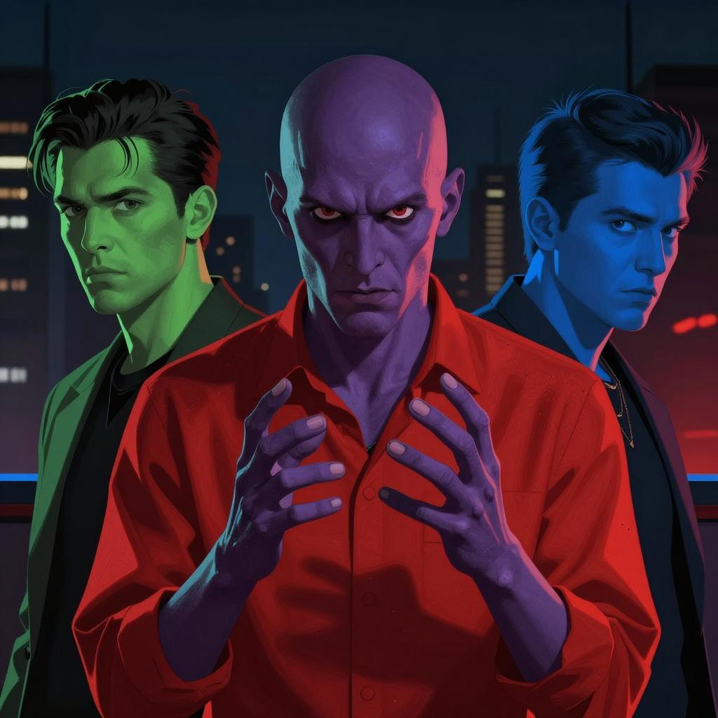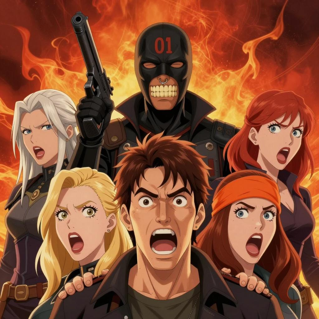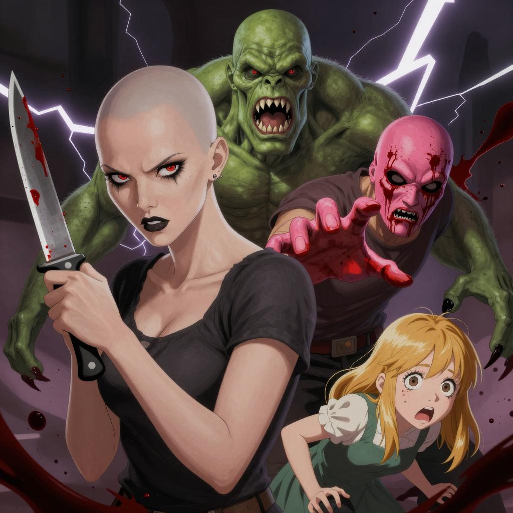 Illustration of horror characters. Bald woman with intense expression, holding blood-stained knife, foreground. Large green-skinned monster with sharp teeth, background. Man in pink, blood-stained mask, reaching forward, right. Small girl with frightened expression, blonde hair, bottom right. Lightning bolts and splashes of blood, background. Dark, chaotic composition.
