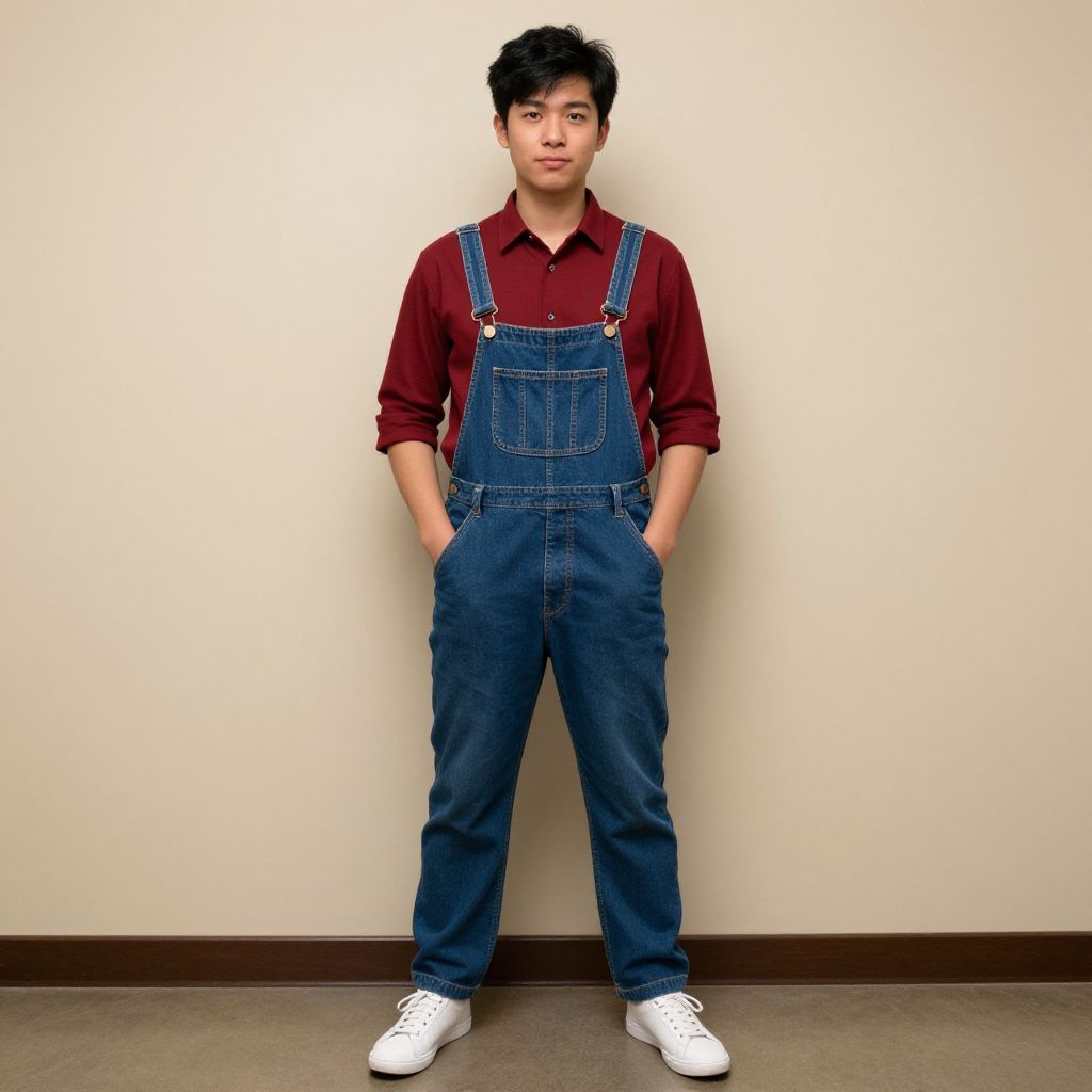 "sweetheart adult costume, 1boy, male focus, solo, hands in pockets, overalls, sneakers, shoes, shirt, red shirt, full body, standing, indoors, parody, black hair, white footwear, denim, looking at viewer Realistic photo of casual sexy person with pretty face"