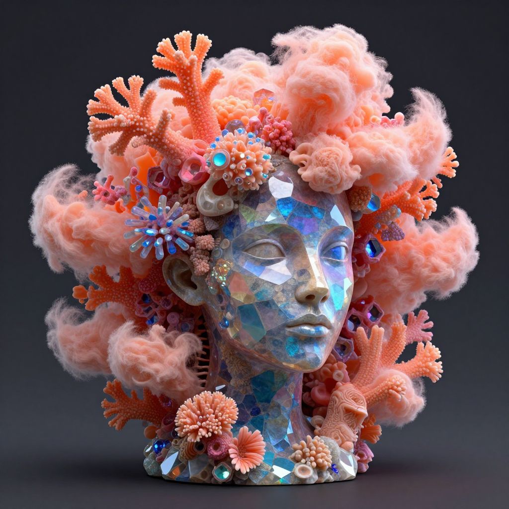 The image presents a striking abstract sculpture of a woman's head, reminiscent of Filip Hodas' work, and trending on ZBrush Central. This hyper-realistic piece is rendered in Arnold, utilizing 8k ray tracing for an unparalleled level of detail. The sculpture is composed of intricate, colorful corals that resemble gemstones, radiating in a neon spectrum of orange, pink, and blue hues. These corals are not just static; they appear to be in a state of dynamic expansion, as if exploding outward from the head. The texture of the corals is soft and organic, reminiscent of cotton candy, while the head itself is made of crystalline materials like bismuth, giving it a glassy, reflective quality. The overall composition is balanced, with the head positioned centrally, surrounded by the vibrant, expansive corals that create a sense of depth and movement. The spatial relationships between the head and the corals are complex, with the corals appearing to both envelop and emerge from the head, creating a sense of interplay between the two elements.