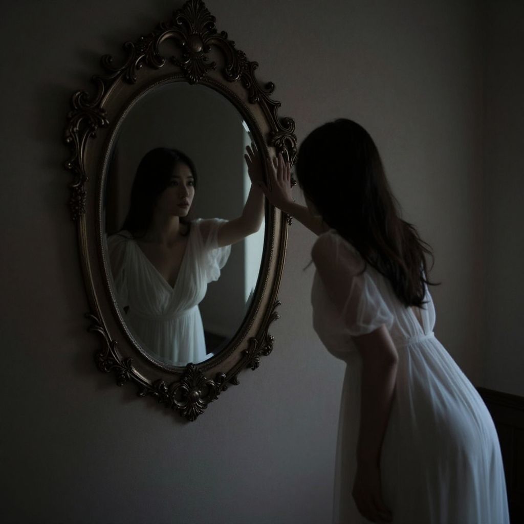 Silhouetted against a dimly lit wall, a woman in a flowing white gown reaches out toward an ornate mirror, her reflection mirroring her gesture as if reaching back through the glass, creating an ethereal interplay of light and shadow in a hauntingly serene room.