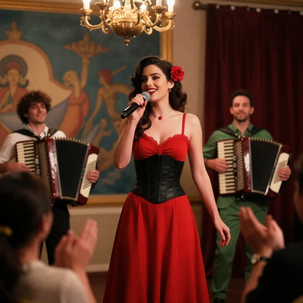 Photograph of a woman in a red dress and black corset with a red flower in her hair, performing on a stage. She holds a microphone, smiling. Background includes a man playing an accordion, another man in green, and a mural. Audience members clap, facing her. Ornate chandelier and red curtains.