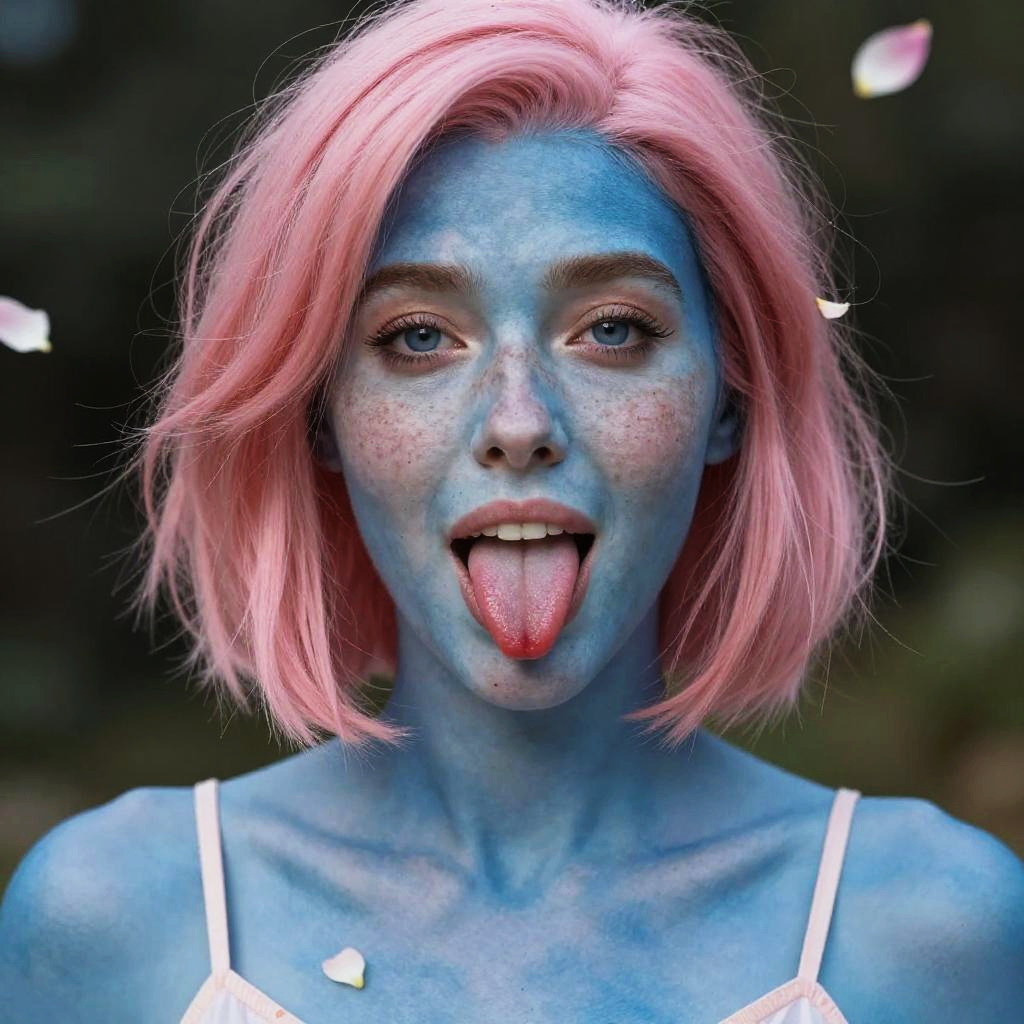 Score_9, score_8_up, score_7_up, score_6_up, score_5_up, score_4_up, 1woman, draenei, blue skin, detailed face, realistic, freckles, pink hair, bob cut Hairstyle, fantasy, extremely detailed, beautiful eyes, tongue out, long tongue, flower petals, garden