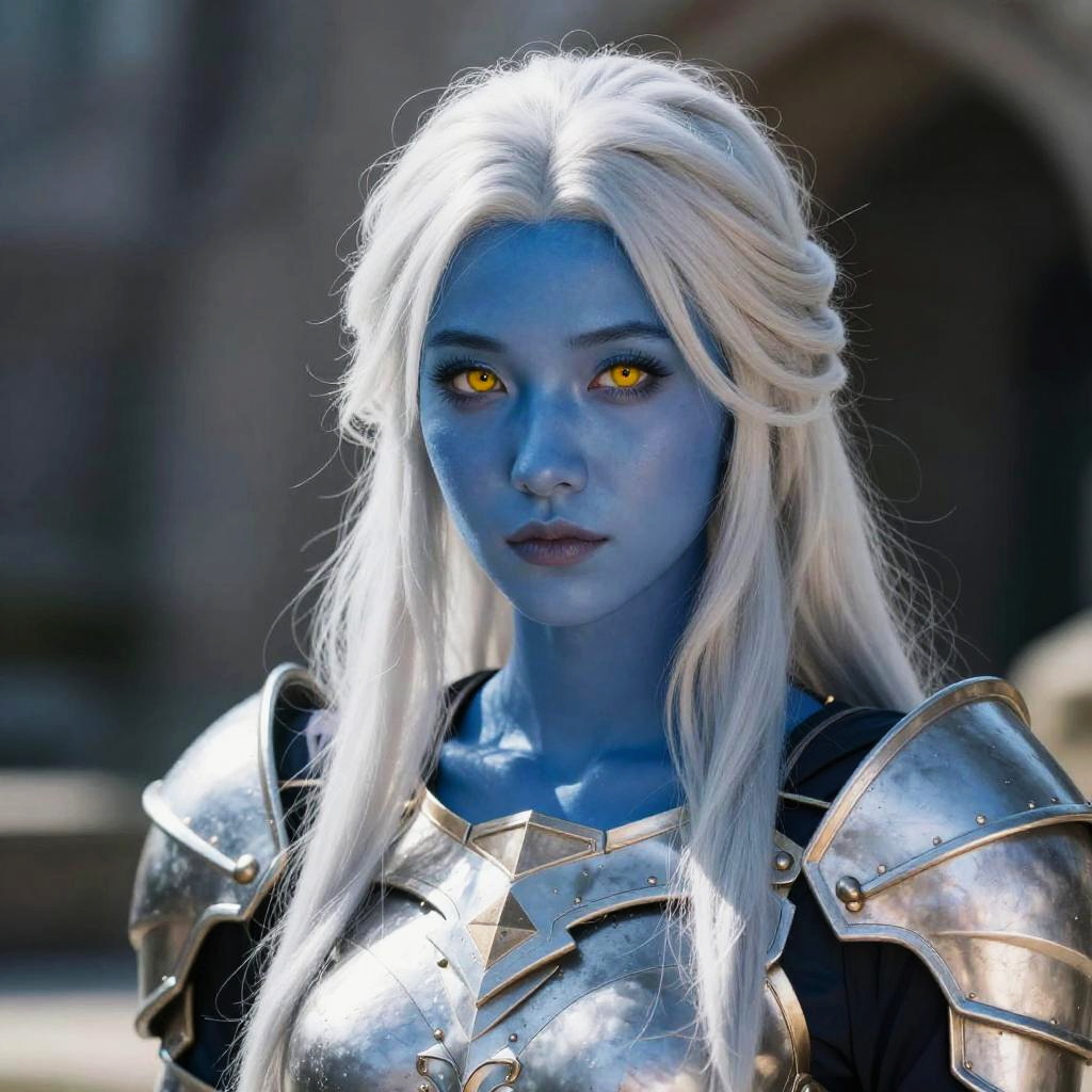 Photograph of a blue-skinned woman with pink bob haircut, pointed ears, and playful expression, sticking out her tongue. Background is blurred greenery