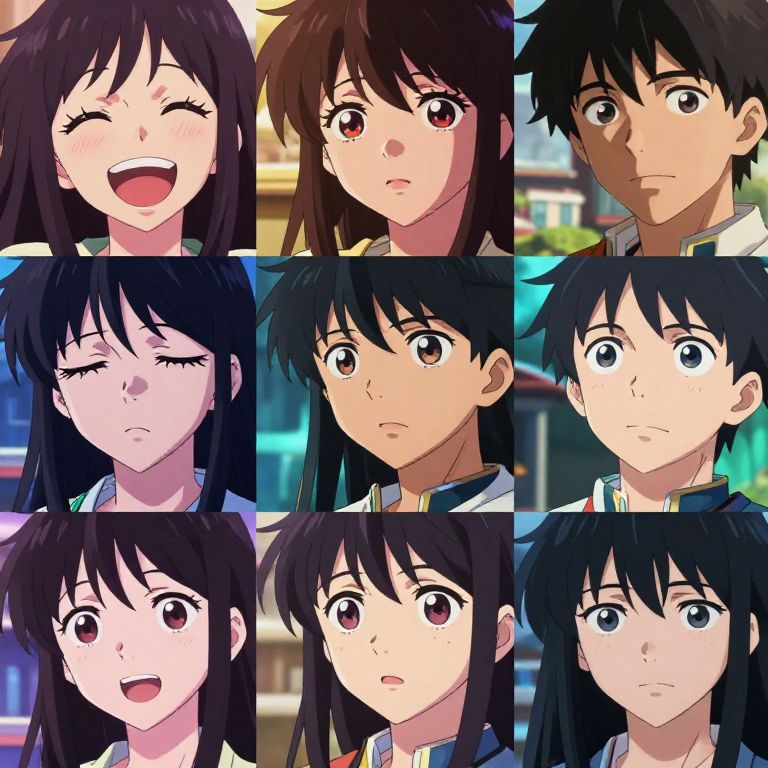 AI generated anime faces, multiple characters exhibiting different emotions like joy, sorrow, anger, each rendered with vibrant anime-style shading, detailed backgrounds blurred to keep focus on faces, strong contrast between warm and cool tones, digital fantasy atmosphere