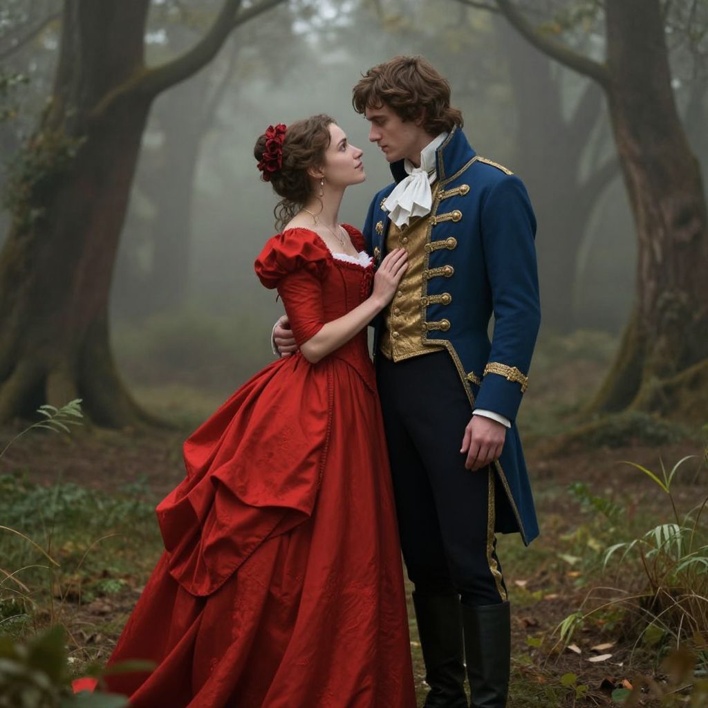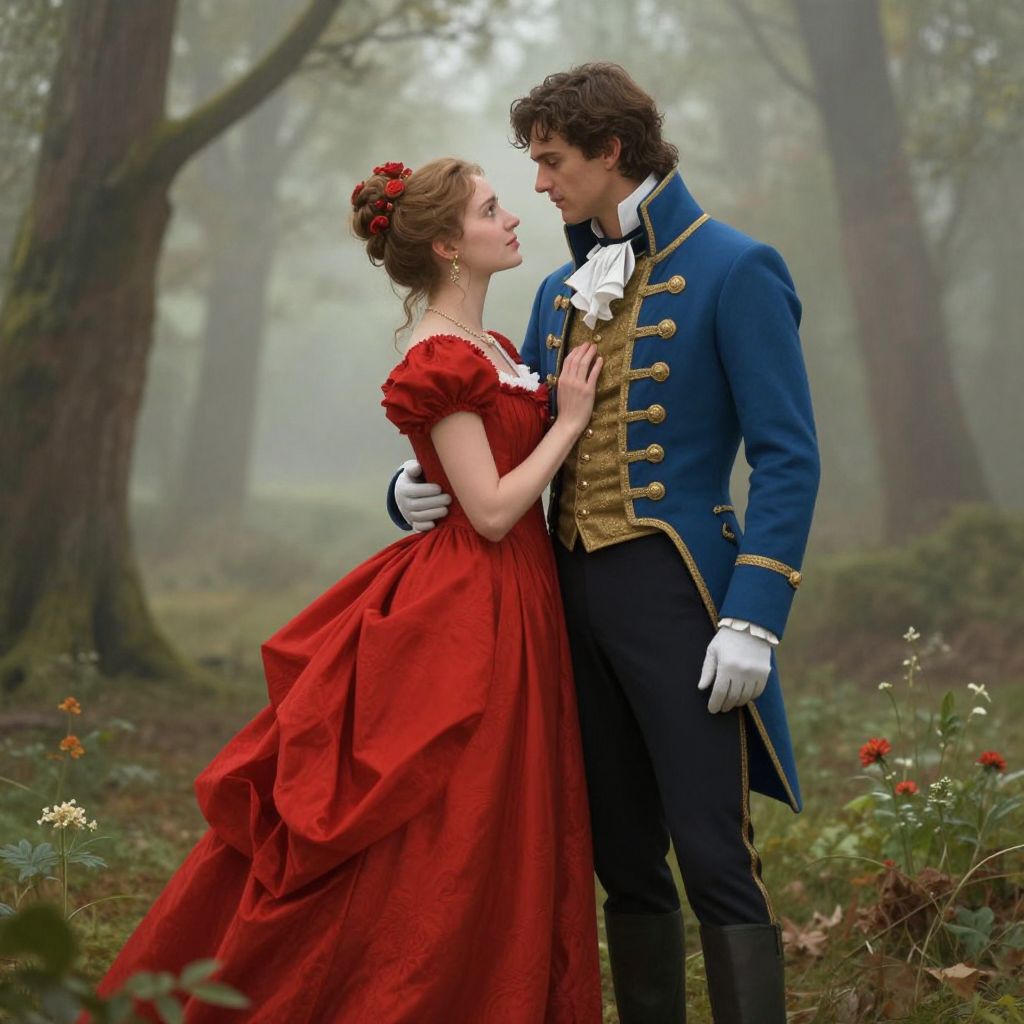 A romantic, high-definition digital illustration set in a misty forest, featuring a couple dressed in elegant period attire reminiscent of Les Misérables, with the woman in a flowing red gown and the man in a regal blue coat adorned with gold embellishments, capturing a timeless, cinematic aesthetic.