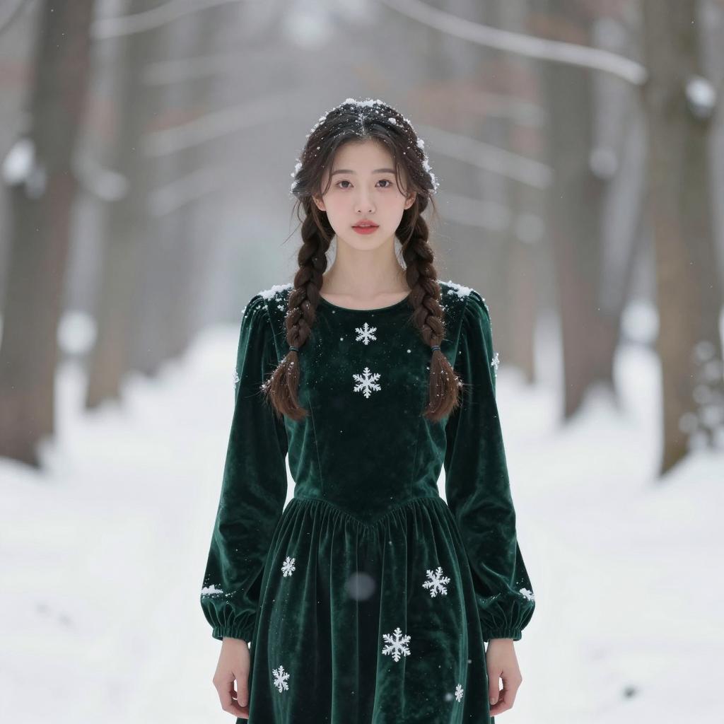 A young woman with braided hair stands in a snowy forest, wearing a deep green velvet dress decorated with snowflakes. The soft snowfall and blurred tree trunks in the background create a serene, almost fairy-tale atmosphere in this realistic winter portrait.