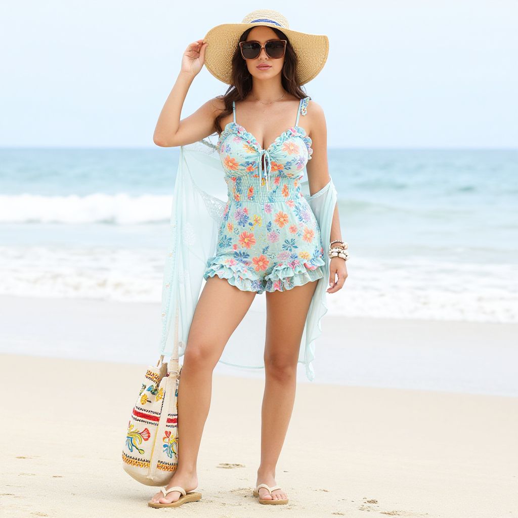 Full body shot, woman, vibrant floral swim romper, lightweight breathable fabric, adjustable straps, high-waisted design, playful ruffles, matching sheer beach vest, lightweight chiffon, open front, loose fit, pastel colors, delicate embroidery, wide-brimmed sun hat, woven straw, oversized sunglasses, chic flip-flops, comfortable rubber sole, beach-ready accessories, layered bracelets, seashell motifs, beach bag, canvas material, vibrant prints Sexy. Pretty face and beаutiful eyes. Big breasts