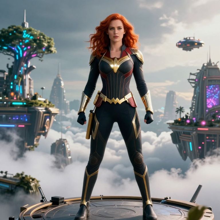 A powerful female with wavy red hair and strong facial features in a dark, high-end female superhero suit featuring a black-and-gold segmented design with embedded lights, standing on a floating city platform above clouds; the setting is cinematic and surreal, with bioluminescent trees and flying vehicles in the distance, highlighting her strength and heroic stance