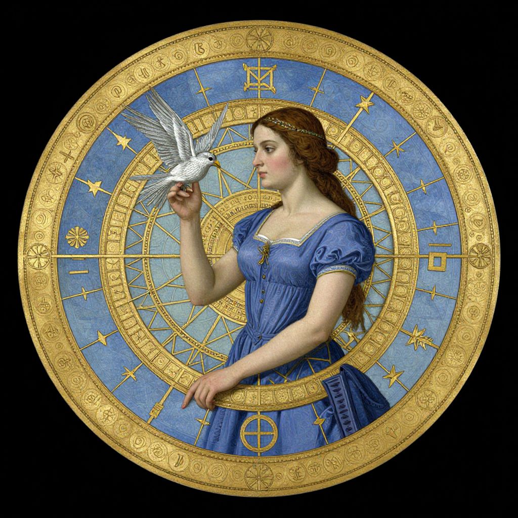 Digital artwork of a fair-skinned woman with brown hair in a blue dress, holding a white dove, set against a golden zodiac circle with blue