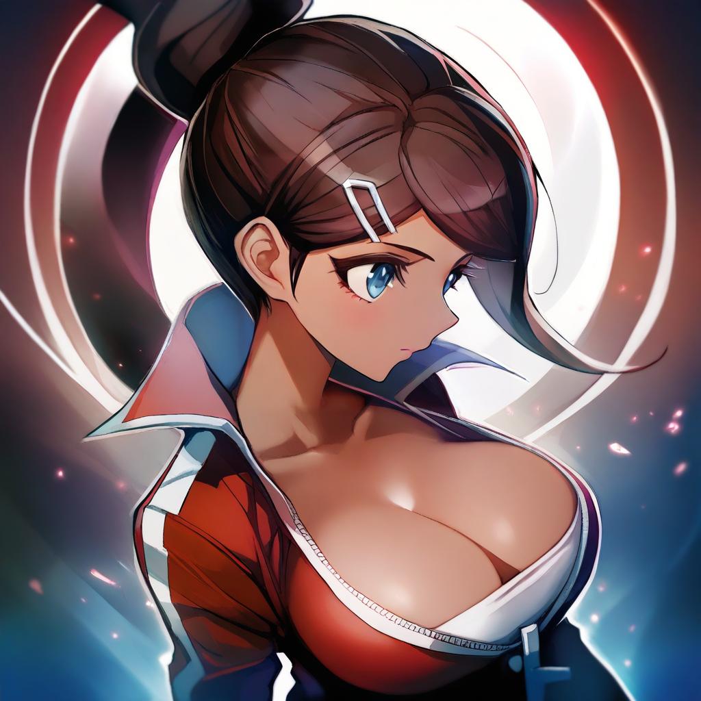 Asahina aoi, danganronpa (series), 1girl, dark-skinned female, blue eyes, brown hair, short hair, long hair, ponytail, hairclip, large breasts, cleavage, collarbone, by artist taishi (picchiridou), animagine