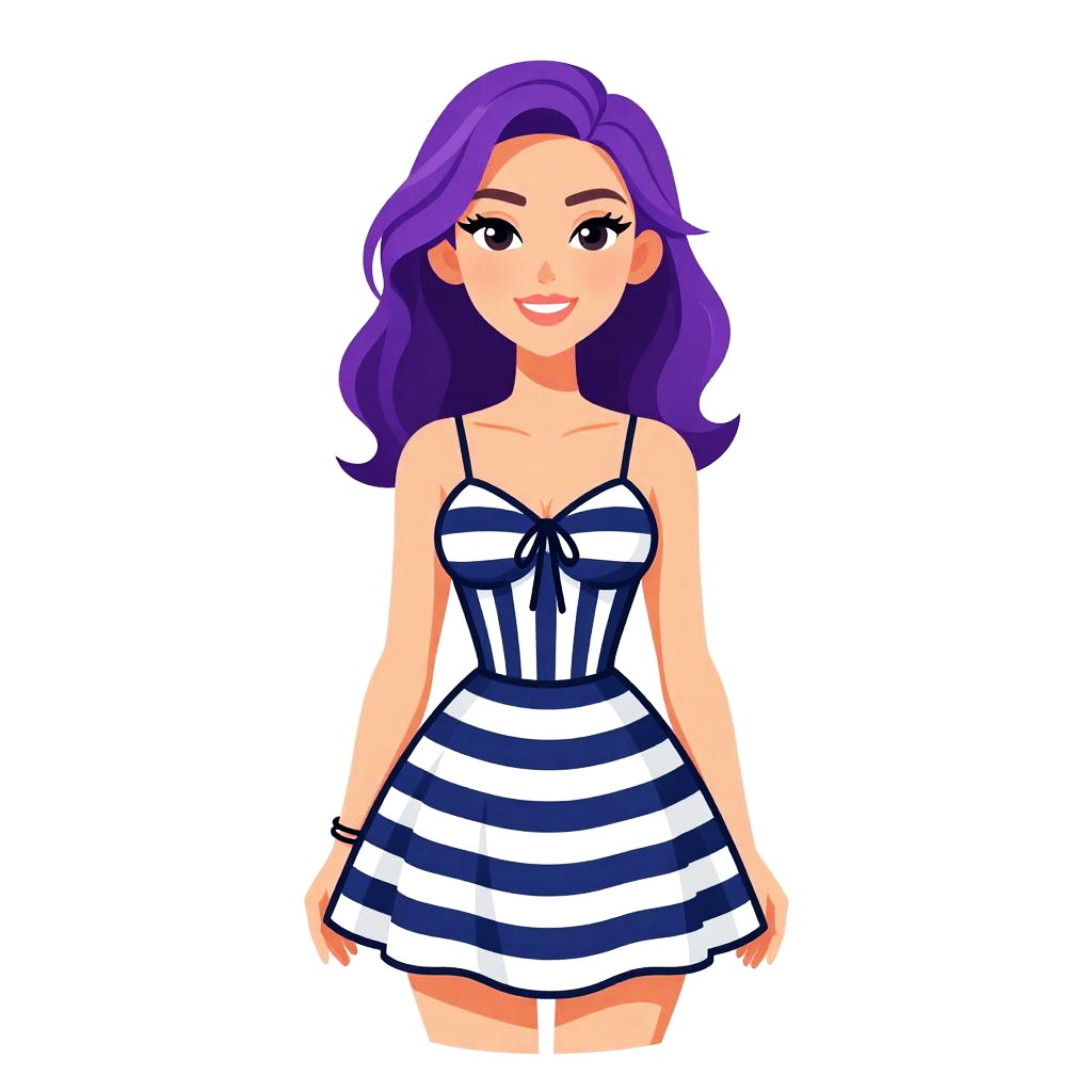 Digital illustration of a smiling woman with purple hair wearing a blue and white striped, sleeveless, tie-front dress against a white background.