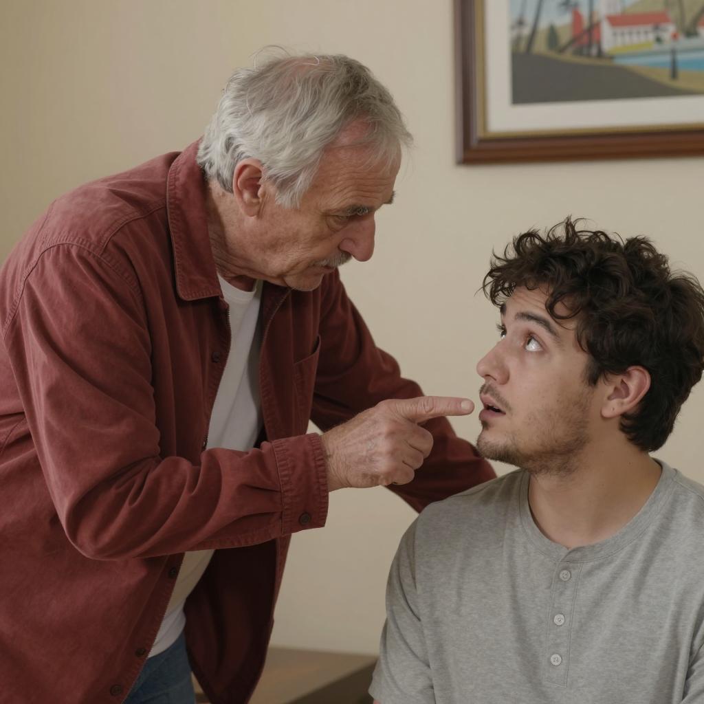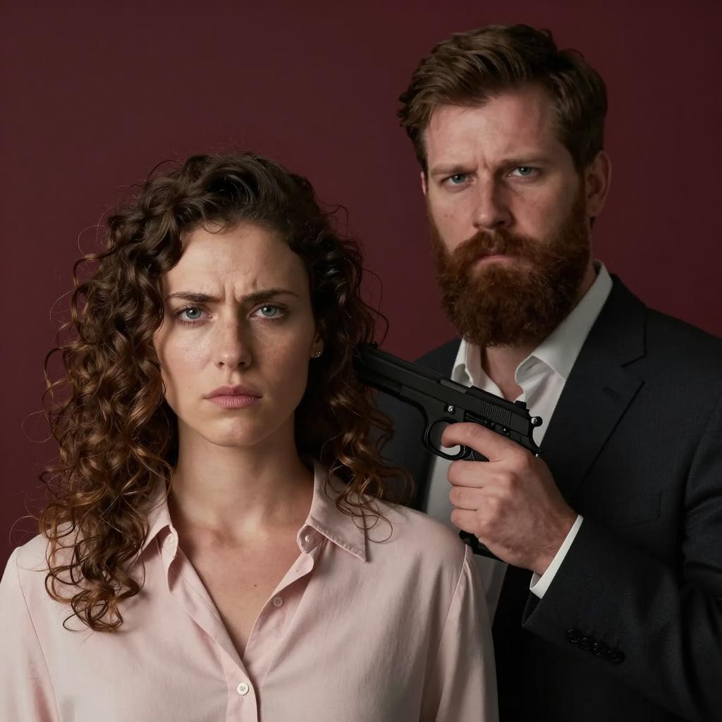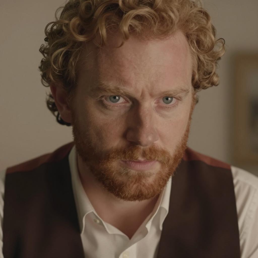 Two men in a tiled bathroom, facing each other in profile. Man on left has short brown hair, beard, white shirt, intense expression. Man on right has red hair, blue shirt, no expression. Black and white tiles, window in background.