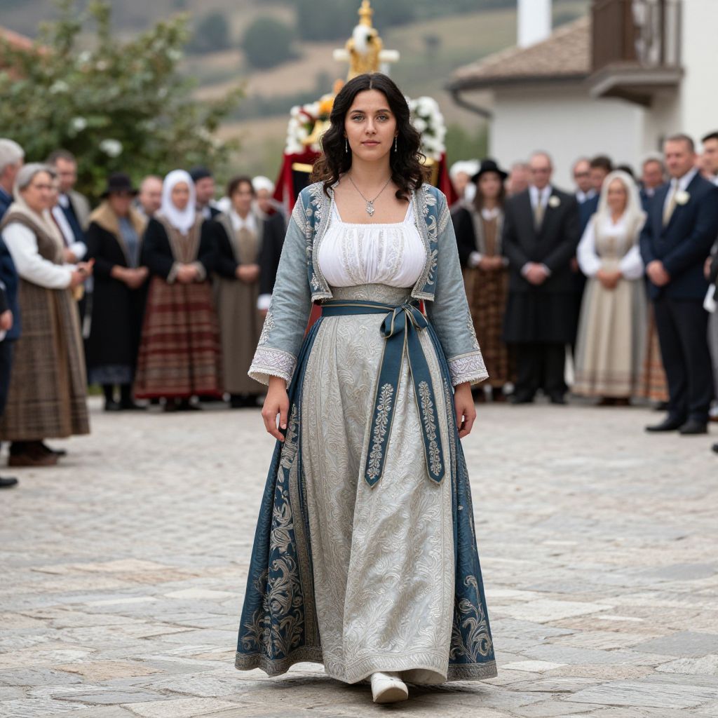 A ceremonial wedding procession in a rural village in southern Europe, a beautiful woman with dark wavy hair and soft green eyes wearing a long, flowing traditional gown with intricate silver embroidery and a wide sash, walking slowly down a stone-paved street with villagers in traditional dress lining the path.. The woman has big tits and cute face