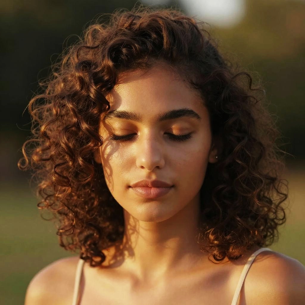Artistic close portrait focusing on honey skintone with natural curls, golden lighting enhancing warm skin tones, soft expression with eyes closed, panoramic natural background blurred to emphasize subject, vibrant colors, detailed skin texture, warm ambient glow.