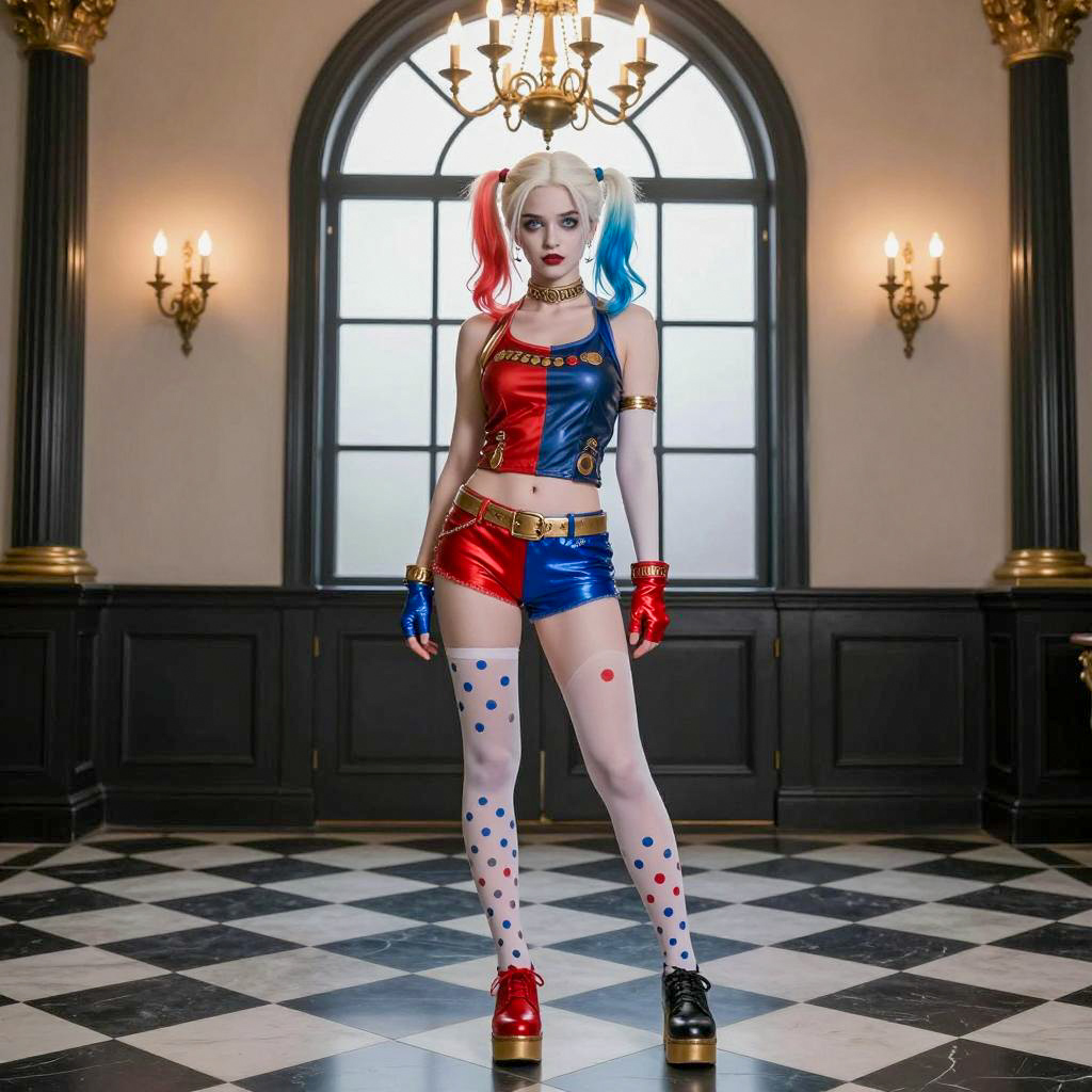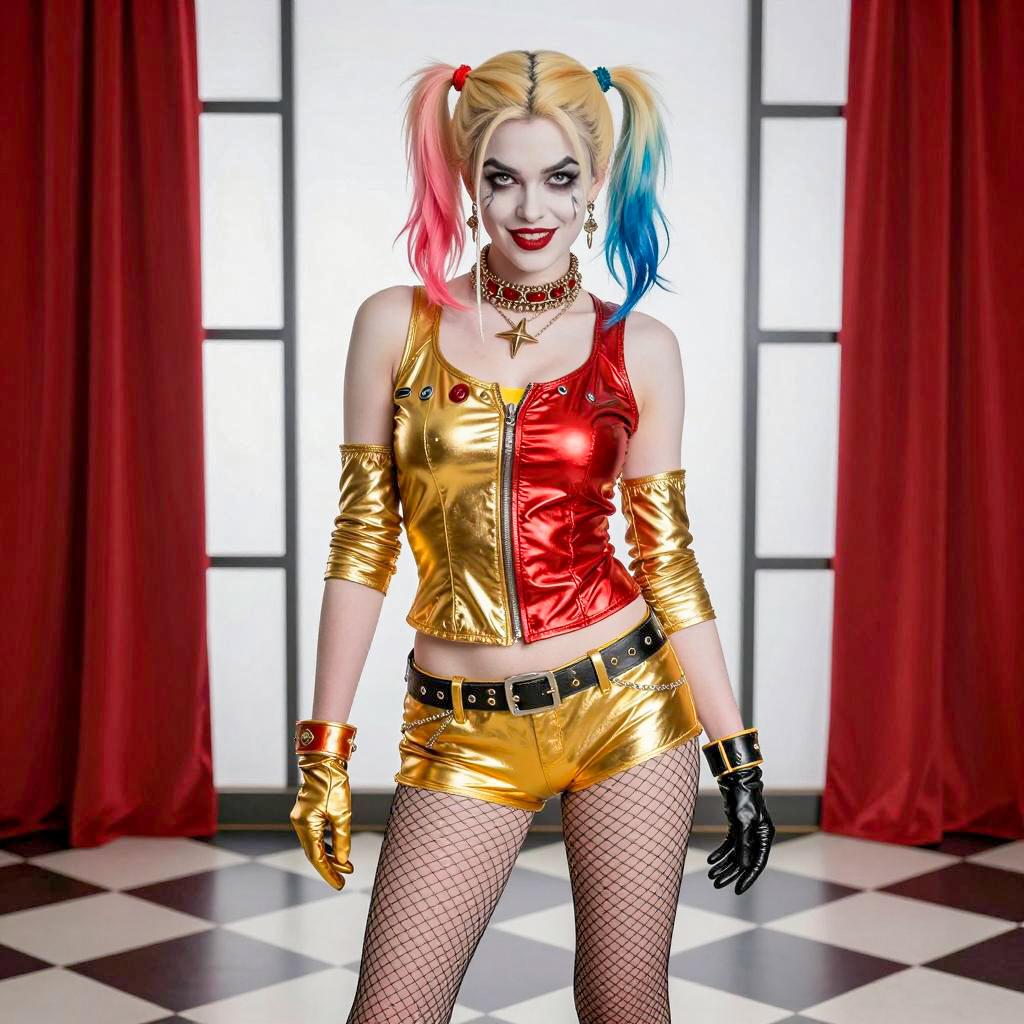 Harley quinn gold costume, photorealistic, Harley Quinn cosplay, blonde pigtails, red and gold leather top, yellow skirt, fishnet stockings, black gloves, jewelry necklace, intense expression, indoor setting, checkered floor, red curtains, vertical window panes, realistic lighting, digital art, detailed ures, realistic shadows, character centered, front view, full body shot
