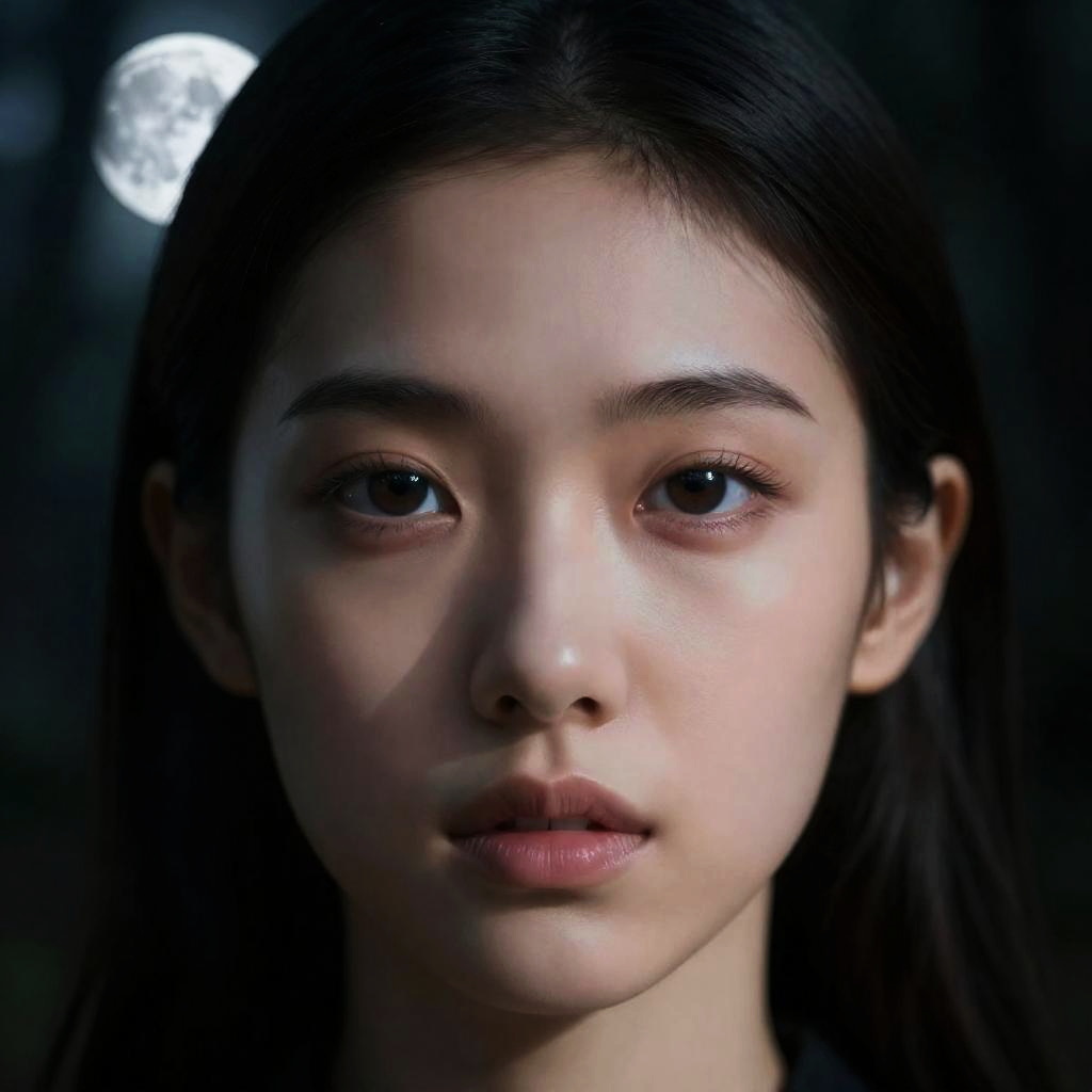 "Beautiful woman. Detailed face. Open eyes. Scifi vibes. Otherworldly. Cinematic. Ominous, digital art, moon, forest, beeple and jeremiah ketner, symetrical, realism. over detailed art, intense colors. High contrast. music album art. Mysterious, colorful cartoon, electric mind, 2d cartoon