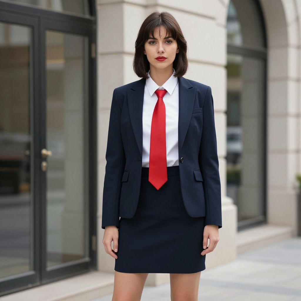Trendy Woman Office Wear Costume, woman in a suit and red tie standing outside of a building