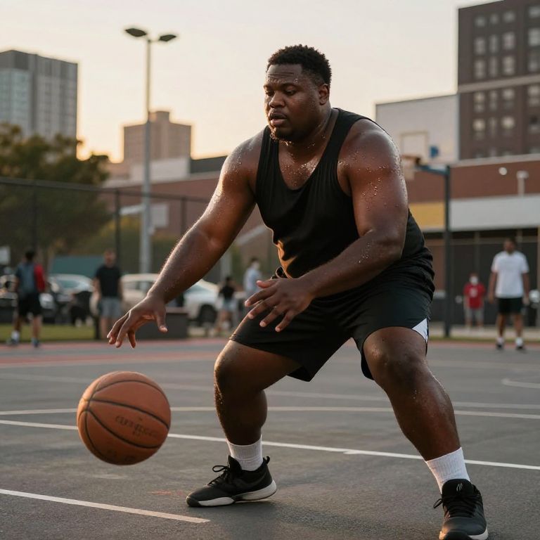 Big fat black guys playing basketball in an outdoor urban court, intense action scene, strong muscles, sweat and movement, realistic textures, warm sunset lighting, vibrant cityscape in the background.