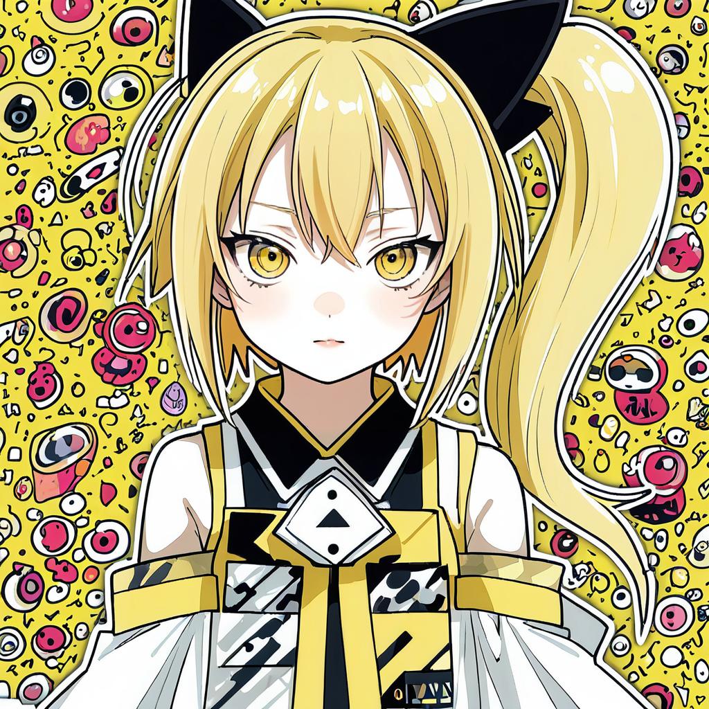 Digital anime-style illustration of a young girl with very long blonde hair tied in a side ponytail. She has striking yellow eyes and wears a unique outfit featuring detached sleeves and a black and yellow color scheme. The character is set against a vibrant yellow background with various abstract cartoon shapes and eyes, creating a dynamic and energetic visual effect.