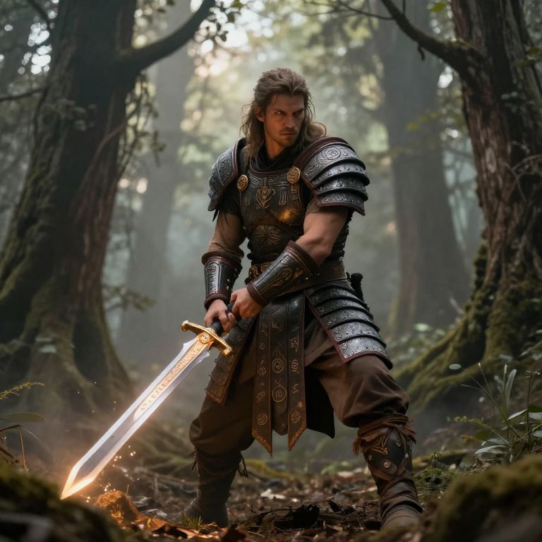 Male warrior in ancient armor, holding a glowing sword, standing in a misty forest with towering trees, mysterious runes on his armor, strong and determined look, fantasy style with rich earthy tones and soft sunlight filtering through leaves