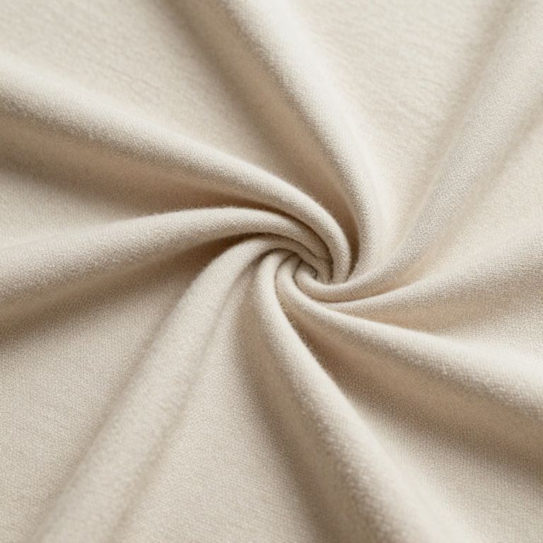 This is a close-up photograph of a fabric featuring a swirling, pleated pattern. The fabric is a smooth, satin-like material with a subtle sheen, displaying a gradient from off-white to light beige. The texture appears soft and slightly reflective, with gentle folds creating a spiral motion at the center. The lighting highlights the fabric's smoothness and the subtle texture of the pleats. The overall composition is centered and symmetrical, focusing on the fluid, twisting pattern of the fabric. The image has a realistic and detailed style, emphasizing the texture and movement of the material.