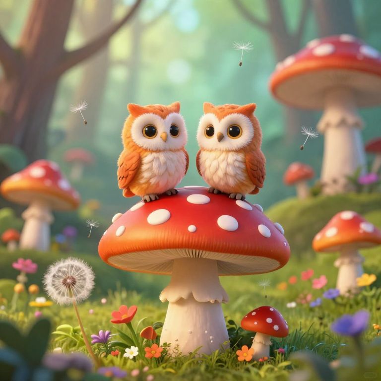 Two fluffy owls perch atop a vibrant red mushroom dotted with white spots, surrounded by a whimsical forest landscape filled with levitating mushrooms, colorful wildflowers, and floating dandelion seeds under a soft, ethereal light.