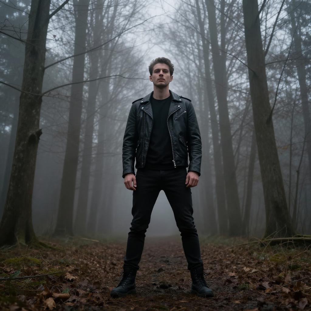 Three naked men with long, dark hair and smeared white paint stand in a dense forest. Foreground man holds an axe, center-right man also holds an axe. Background man stands with hands by sides. All have intense expressions. Green foliage surrounds them.