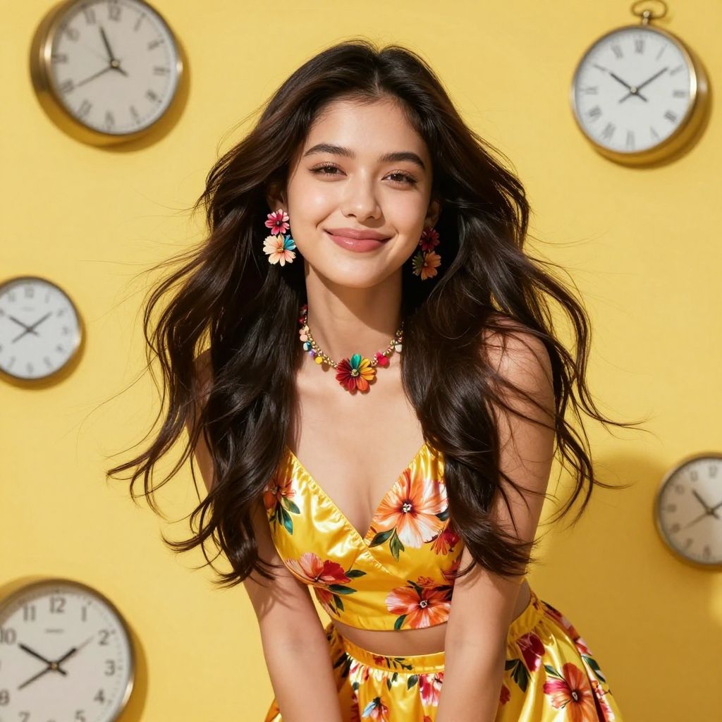 ((Create a highly realistic full body portrait of a young, flat face, slight smile, deep dimple, camera focused around 24 years old. The image should be detailed and lifelike, making it challenging to discern whether it's a real photograph or a digital creation. Focus on achieving realism in her facial features, skin texture, and hair, and ensure the lighting contributes to the overall authentic appearance)). Crop Top. Vibrant colors, Black Brown Hair, Hair is long way and silky, floating in air, outdoor, bright yellow designer floral dress made of shiny reflective material, red and orange shading light, body lean over, shadows, majestic, ((yellow acrylic background, 500mm camera, floral earrings, floral necklace, biting lips with lust)), (((surrounded by clocks floating in air, camera follows rule of third)))