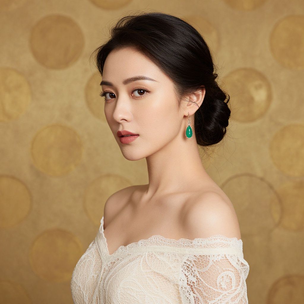 Elegant portrait of a woman with dark, styled hair adorned with a delicate green pendant earring, wearing an off-the-shoulder lace dress against a textured background with golden circular patterns.