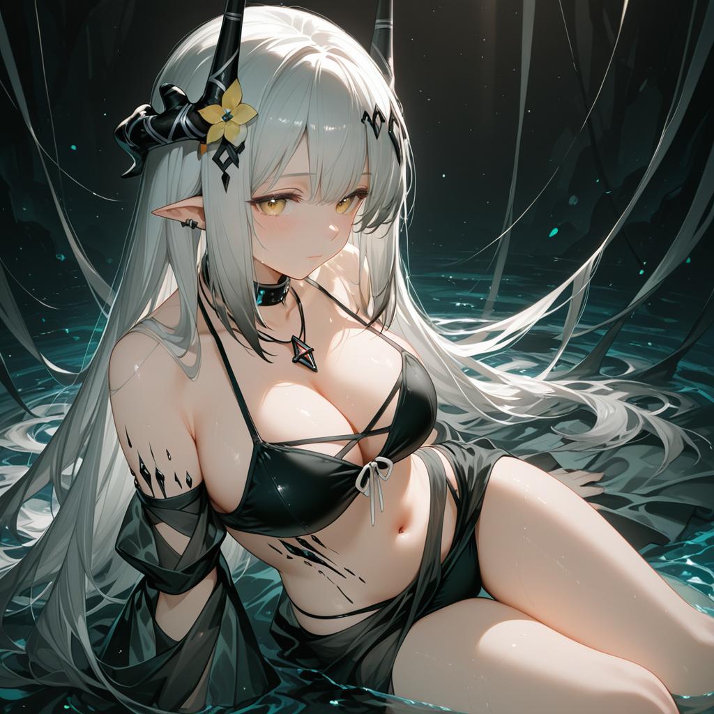 Muelsyse (arknights), arknights, 1girl, pointy ears, yellow eyes, mole under eye, very long hair, brown hair, long hair, long sleeves, black choker, elf, by artist kiira, dark_illustrious