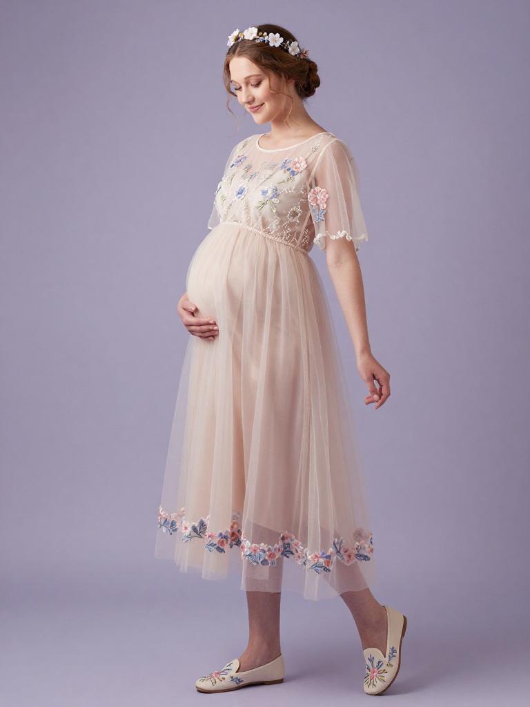 Ethereal Pregnant Woman in Floral Maternity Dress