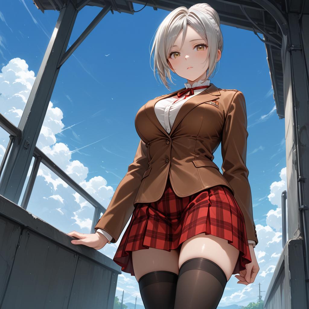 (masterpiece, best quality, detailed), blue sky, clouds, from below, cowboy shot, 1girl, solo, shiraki meiko, black thighhighs, plaid skirt, ribbon choker, brown jacket, looking at viewer