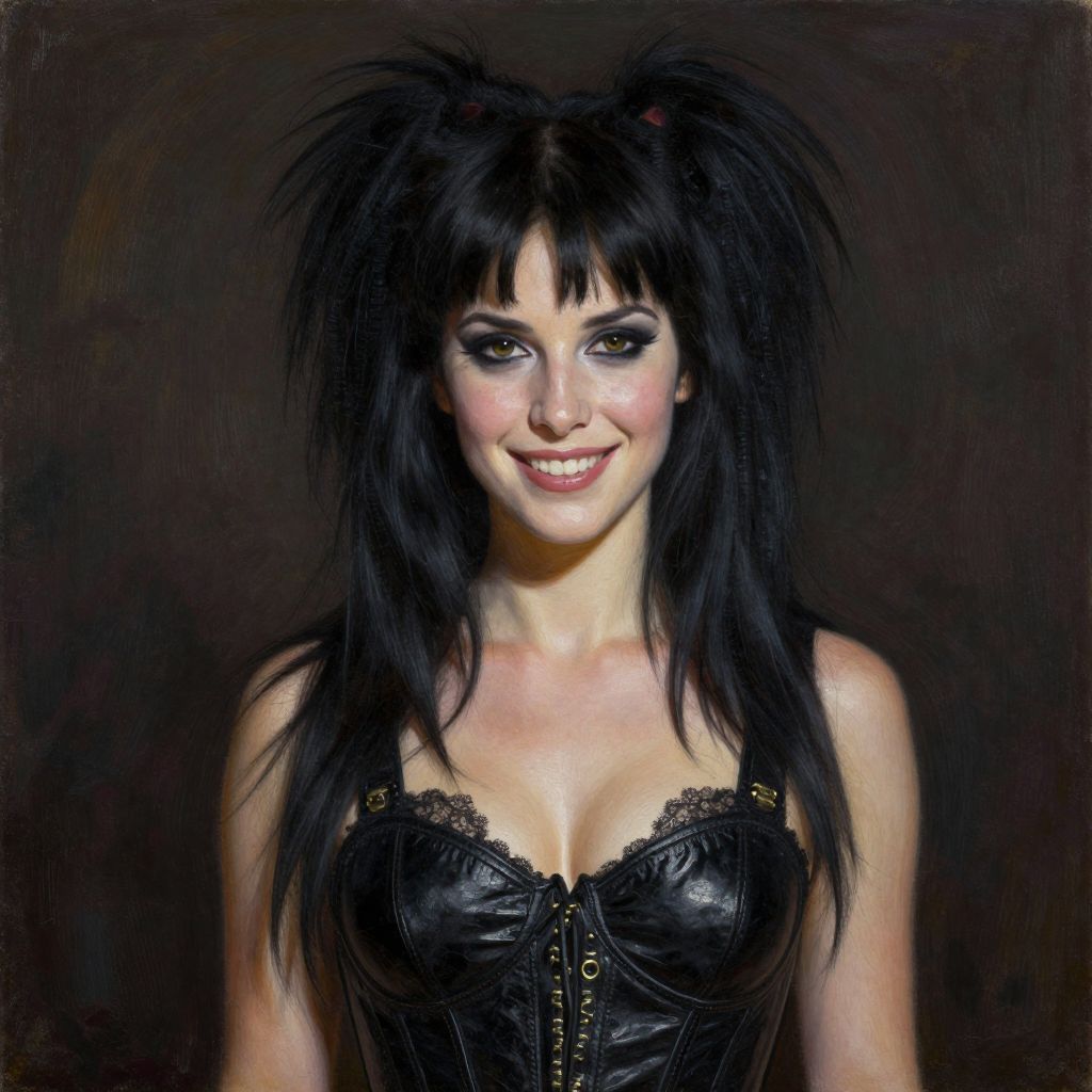 Oil painted portrait of young jennifer connelly as death from sandman, gentle smile, puffy black 80 s hair, leather corset and black lace, by cedric peyravernay, drew struzan, alphonse mucha, by jeremy mann, by lecouffe deharme, gothic, goth chic, soft lightning, egyptian eyeliner, punk rock, high detailed, leather, 8 k, hyperrealism, donato giancola, joseph christian leyendecker, illustration, artgerm