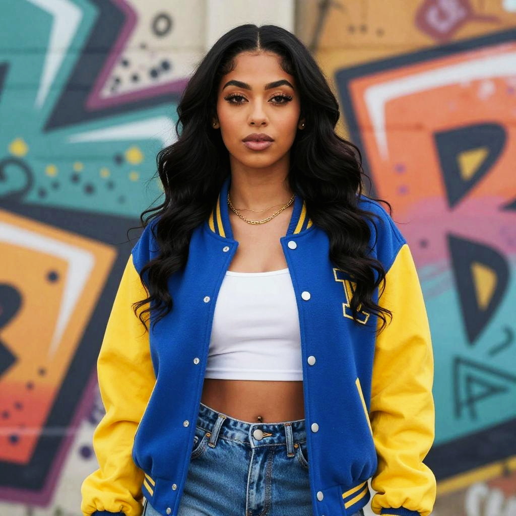Photograph of an attractive young woman with long black wavy hair, medium brown skin, and full lips. She wears a blue and yellow varsity jacket over a white crop top, exposing her midriff, and high-waisted blue jeans. She has large hoop earrings, a gold necklace, and subtle makeup. The background features colorful graffiti on a concrete wall, adding a vibrant urban feel. The image captures her standing confidently, looking directly at the camera. The overall style is modern and street chic.