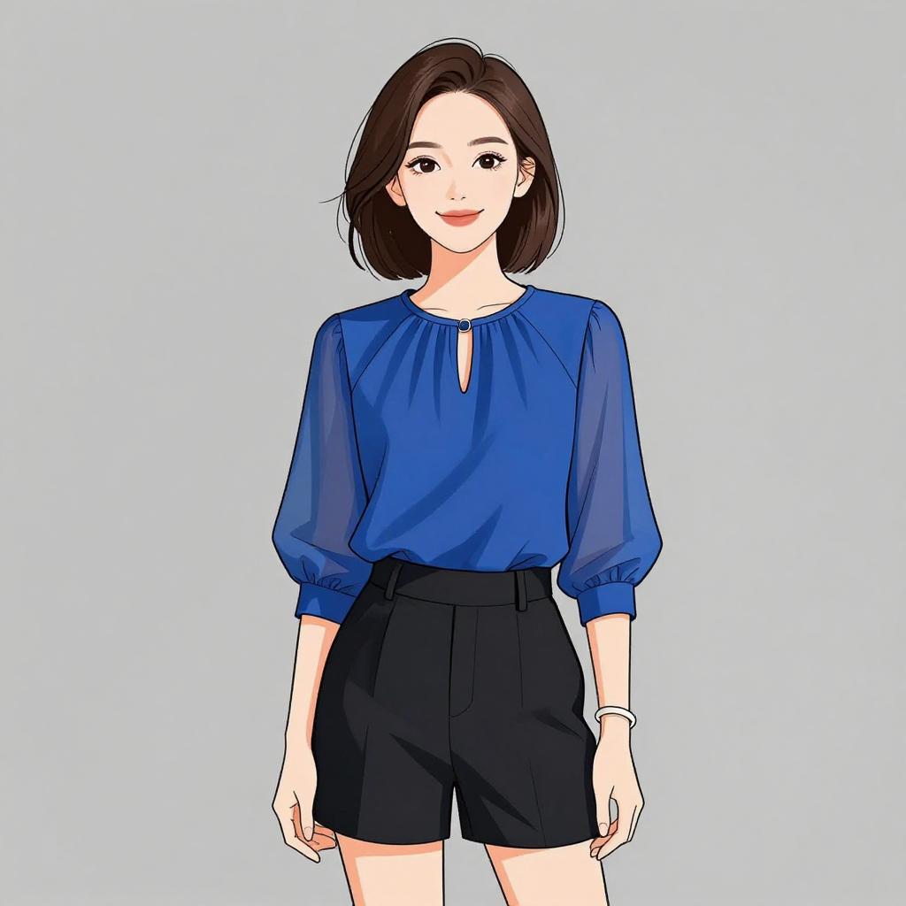 Woman with pretty face and pretty hair. smiling Woman, casual chic, royal blue blouse with sheer overlay, pleated front detail, round neckline, keyhole back closure, three-quarter sleeves with cinched detailing, black tailored shorts, minimalist cuff bracelet. --sref 1467