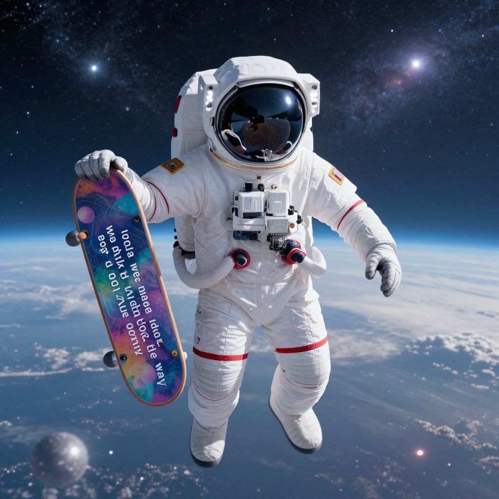 Photorealistic digital art of an astronaut in a white spacesuit with a reflective helmet, holding a colorful skateboard, floating in space with Earth below and