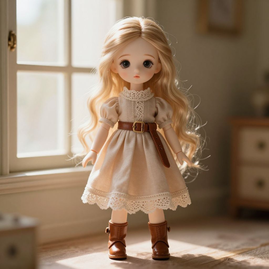 A female doll with long, flowing blonde hair, delicate porcelain skin, and large expressive eyes, wearing a soft beige dress with a delicate lace trim, a brown leather belt securing the waist, and polished brown boots that match the dress's vintage aesthetic. The doll stands in a quiet, sunlit room with soft golden light streaming through a window, giving it a gentle, nostalgic charm. The overall style is whimsical and detailed, blending vintage doll aesthetics with a touch of modern elegance.