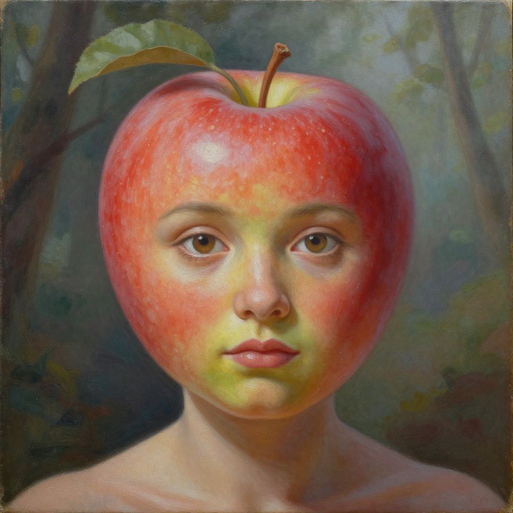 Painting with apple face, imaginative artwork portraying a figure whose face is a shiny apple, hyper-realistic style blending detailed fruit textures and human characteristics, set in a mysterious forest with soft mist and ethereal lighting.