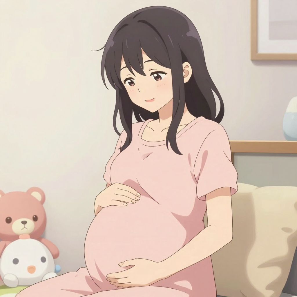Anime-style digital drawing of a pregnant woman with long black hair, wearing a pink shirt, sitting on a couch, hands on her belly, with a