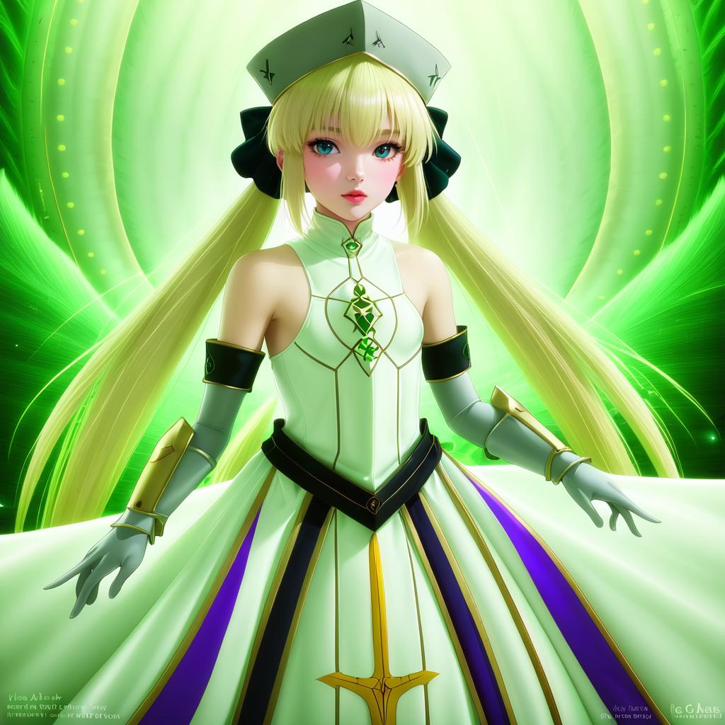 Artoria caster (first ascension) (fate), fate/grand order, 1girl, green eyes, hair between eyes, blonde hair, long hair, twintails, ahoge, small breasts, grey gloves, hat, grey headwear, sleeveless dress, white dress, bare shoulders, by artist kannko bokujou, anime