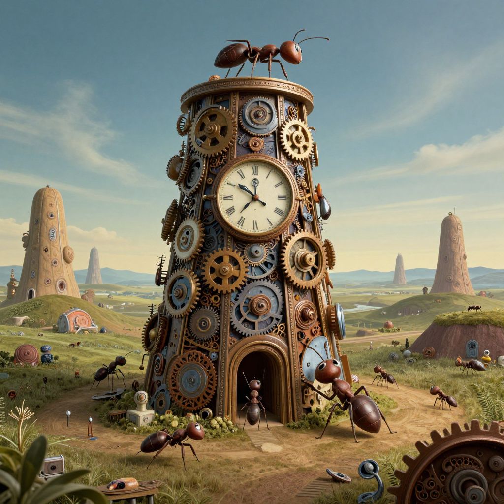 A whimsical digital illustration depicting a tall, cylindrical clock tower adorned with interlocking gears, cogs, and clock faces of various sizes. The tower stands in a vibrant, rolling countryside with grassy hills, distant stone structures, and a clear blue sky. Insects, including ants and beetles, scurry around the tower's base, and small, colorful houses dot the landscape. The clock tower's texture is metallic with a mix of rusty and polished surfaces, and a small ant sits atop it. The overall style is surreal and steampunk-inspired, blending natural and mechanical elements seamlessly.
